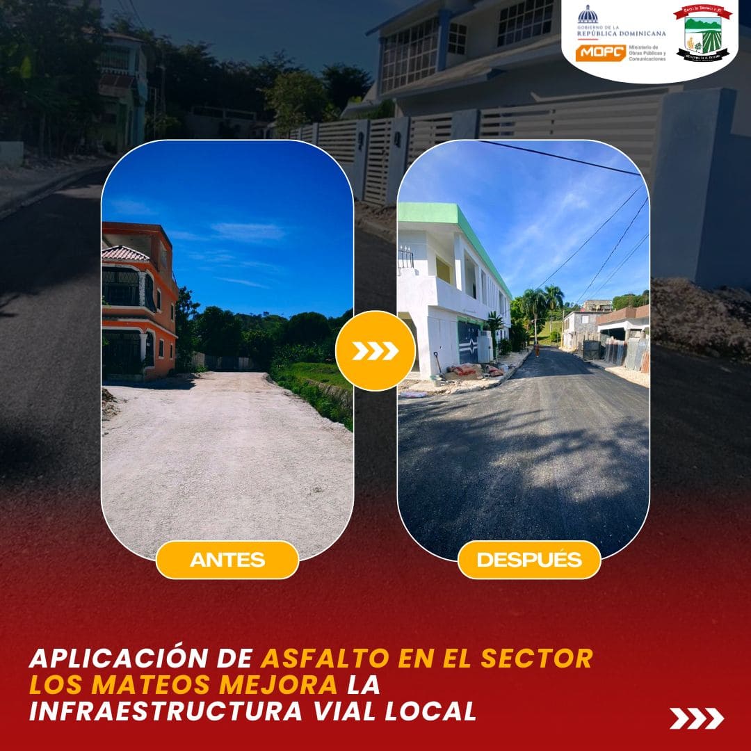 El sector Los Mateos ha sido intervenido con trabajos de aplicación de asfalto, como parte del programa de rehabilitación vial ejecutado por el Ministerio de Obras Públicas y Comunicaciones (MOPC). Esta obra responde a la necesidad de mejorar la conectividad urbana, facilitar el tránsito seguro y elevar la calidad de vida de los residentes.