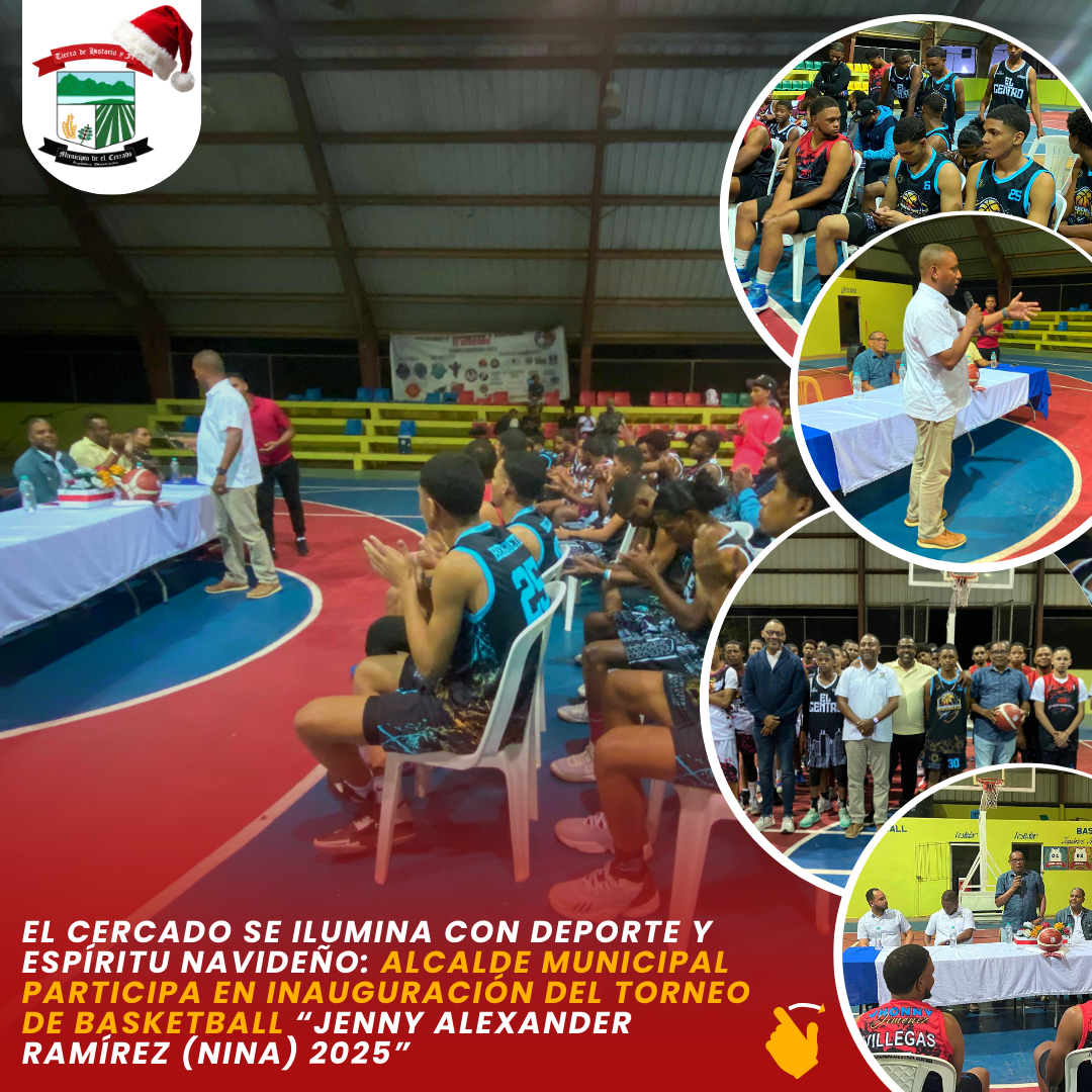 El pasado viernes se realizó la inauguración del Torneo Navideño de Basketball “Jenny Alexander Ramírez (NINA) 2025”, organizado por el Patronato Deportivo y Cultural de El Cercado, en el Techado Municipal. Este evento, que se desarrollará del 12 al 30 de diciembre, busca promover la unidad, la pasión por el deporte y el compromiso con la juventud del municipio.