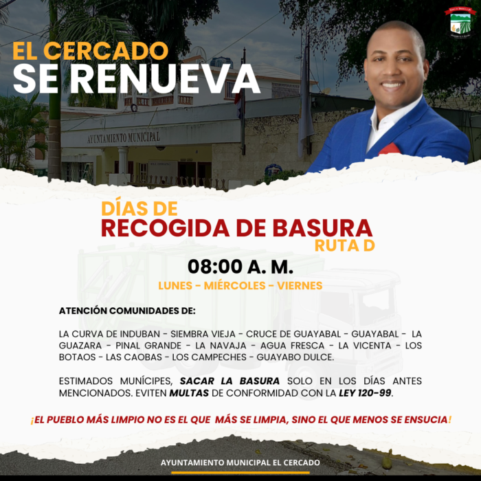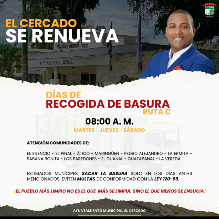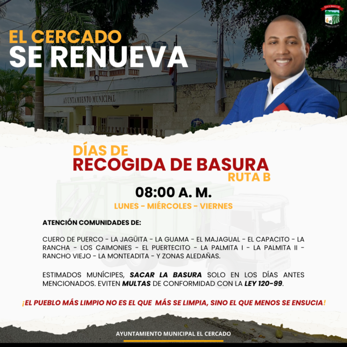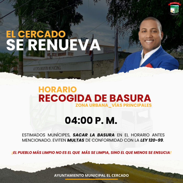A partir del próximo lunes 8 del mes en curso, la recogida de basura se realizará en los horarios antes mencionados…