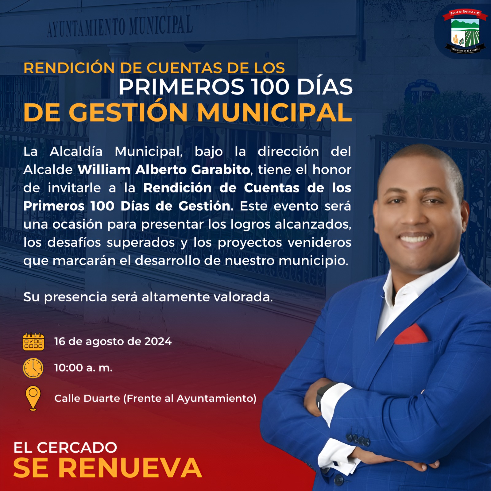 La Alcaldía Municipal, bajo la dirección del Alcalde William Alberto Garabito, tiene el honor de invitarle a la Rendición de Cuentas de los Primeros 100 Días de Gestión. Este evento será una ocasión para presentar los logros alcanzados, los desafíos superados y los proyectos venideros que marcarán el desarrollo de nuestro municipio.