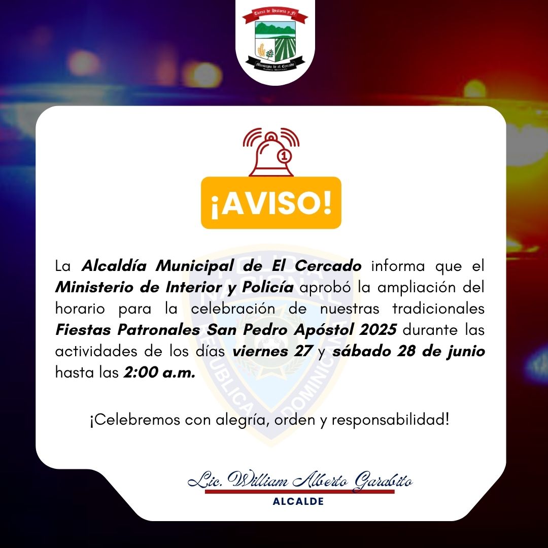 Alcadía Municipal de El Cercado informa a toda la ciudadanía que ha sido emitida la Resolución MIP-UVP-0209-2025 por parte del Ministerio de Interior y Policía, mediante la cual se otorga el permiso oficial de “No Objeción” al Uso de la Vía Pública para la celebración de nuestras tradicionales Fiestas Patronales San Pedro Apóstol 2025, a realizarse del 20 al 29 de junio.