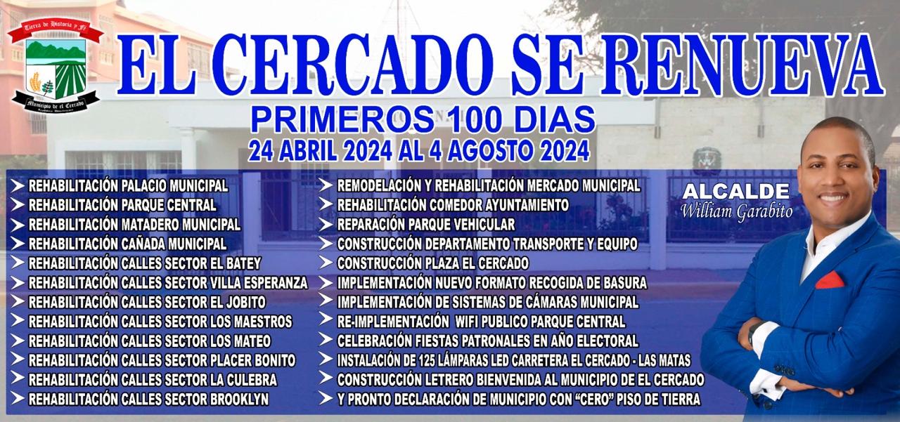 Estos primeros 100 días representan el compromiso y la dedicación de nuestra administración para mejorar la calidad de vida de todos los residentes de El Cercado. Agradecemos al municipio por su apoyo y colaboración constante en este proceso de transformación y progreso.