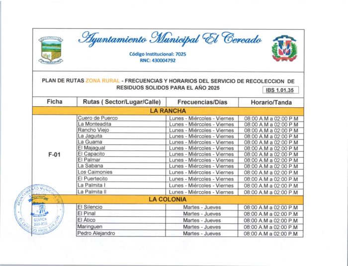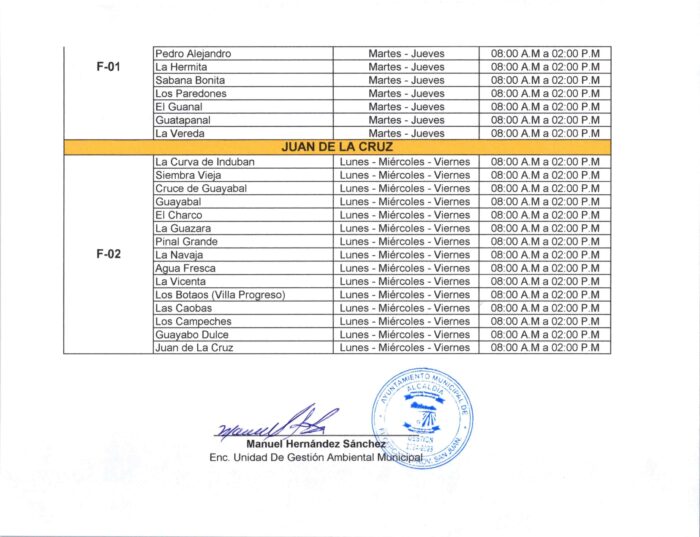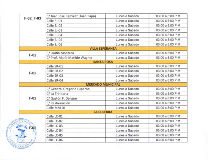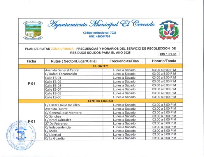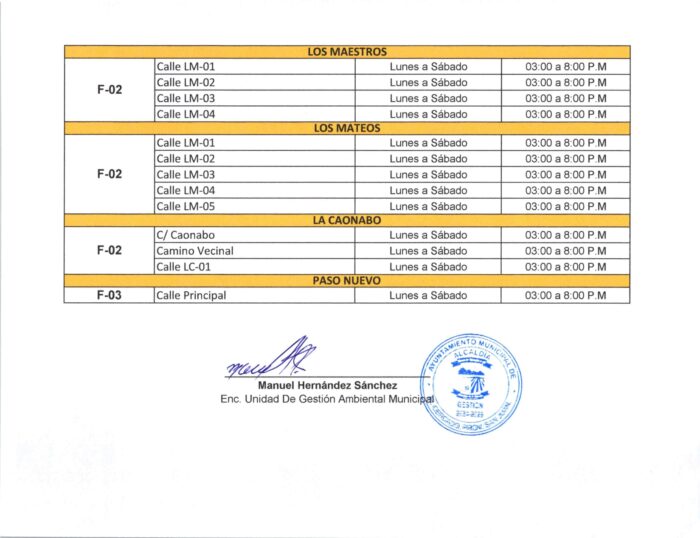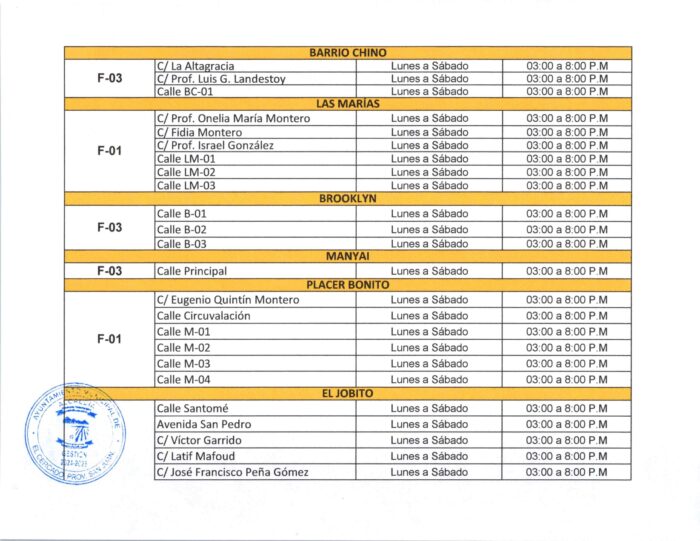 Este plan tiene como objetivo mejorar la eficiencia del servicio de limpieza, garantizar una cobertura adecuada en todas las comunidades y contribuir al orden y la salubridad pública. Invitamos a cada ciudadano a verificar su zona y consultar el horario correspondiente, para colaborar con el cumplimiento del calendario y mantener nuestras calles limpias.