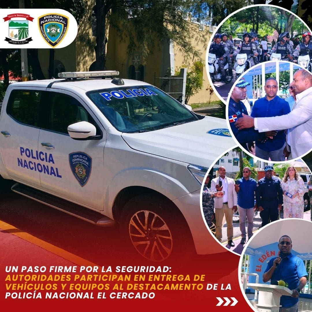 En un acto significativo para el fortalecimiento de la seguridad ciudadana, fueron entregados este viernes una camioneta, cinco motocicletas, cinco cámaras de vigilancia y seis teléfonos celulares al destacamento de la Policía Nacional de El Cercado, con el objetivo de mejorar la capacidad operativa y de respuesta de los agentes en el municipio.